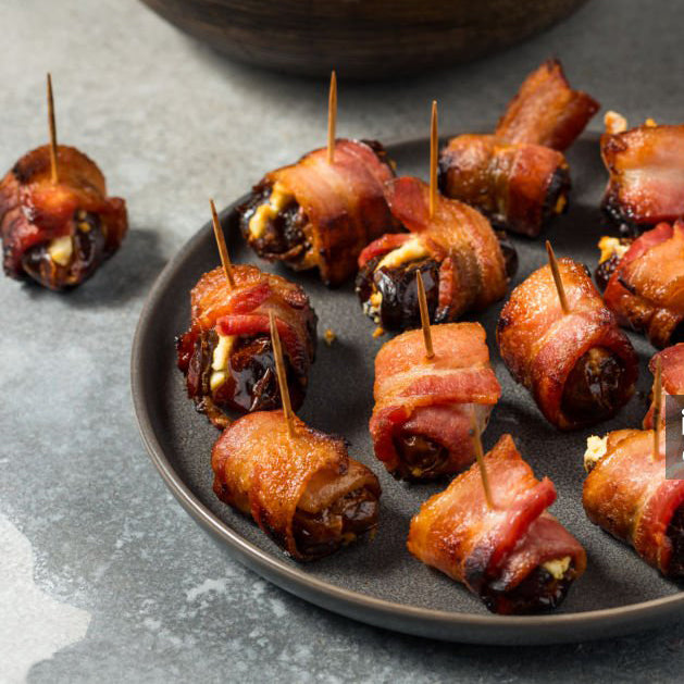 Wrap each date with a half-slice of bacon and secure with a toothpick.