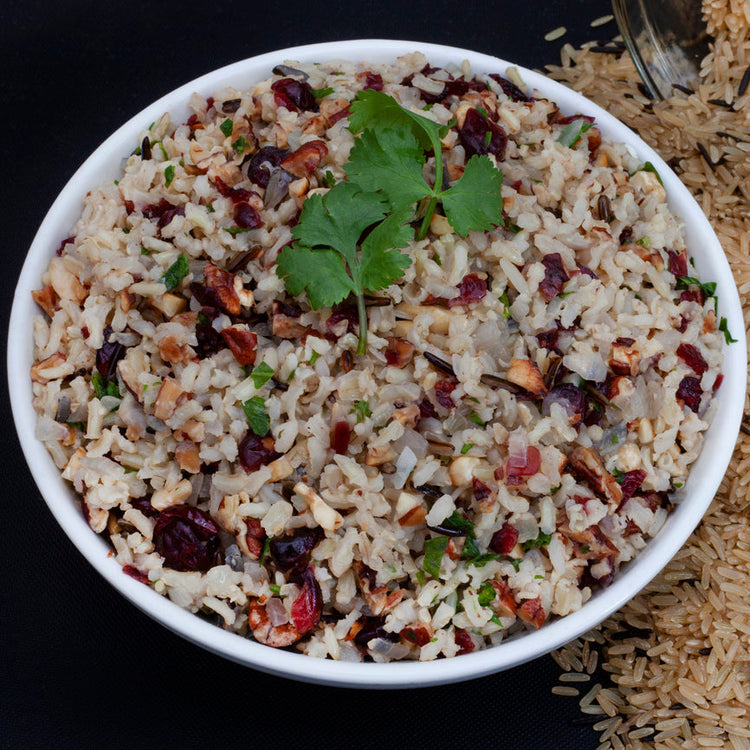 When rice is cooked, fluff with a fork. Stir in sautéed onions, dried blueberries, toasted pecans, salt, pepper, and thyme. Adjust seasoning to taste.