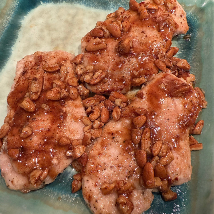 Add honey and pecan pieces to the drippings in skillet and cook over medium heat stirring frequently until pecans are lightly browned.
