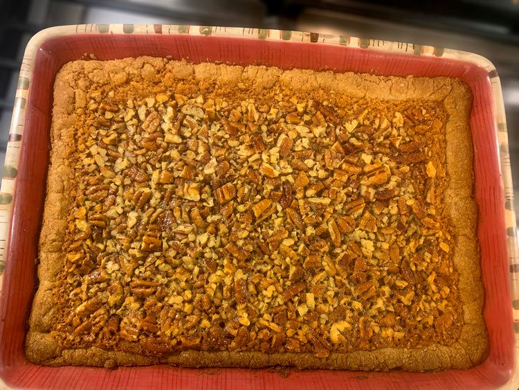 While that bakes, mix the remaining 4 eggs, syrup, sugar, pecans, vanilla and butter until well blended. When the crust is done, immediately pour this mixture over it and bake for an additional 40 minutes or until golden brown.