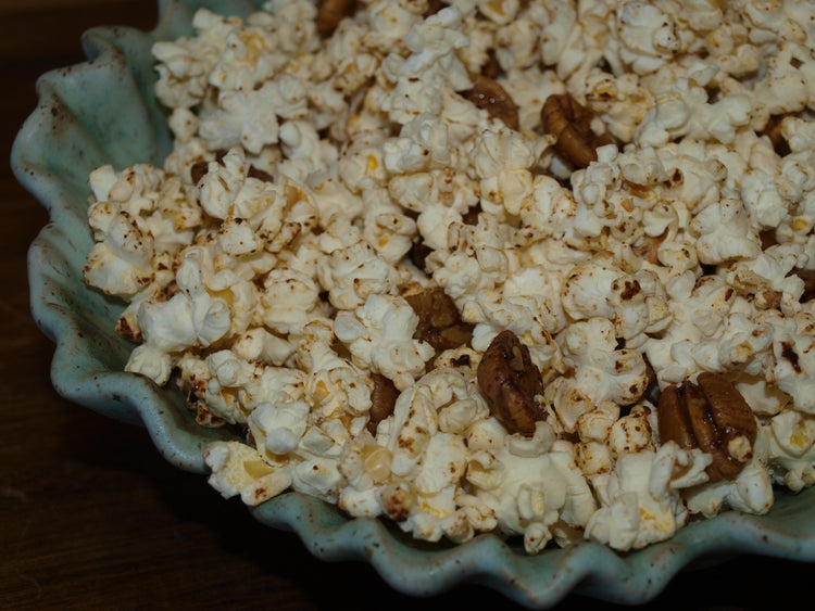 In a skillet, melt butter over medium heat and stir in pecans. When the pecans and butter are coated well, stir in sugar. When the sugar is dissolved, stir in chili powder. Turn off the heat and put the pecans into the popped popcorn bowl. Toss to coat.